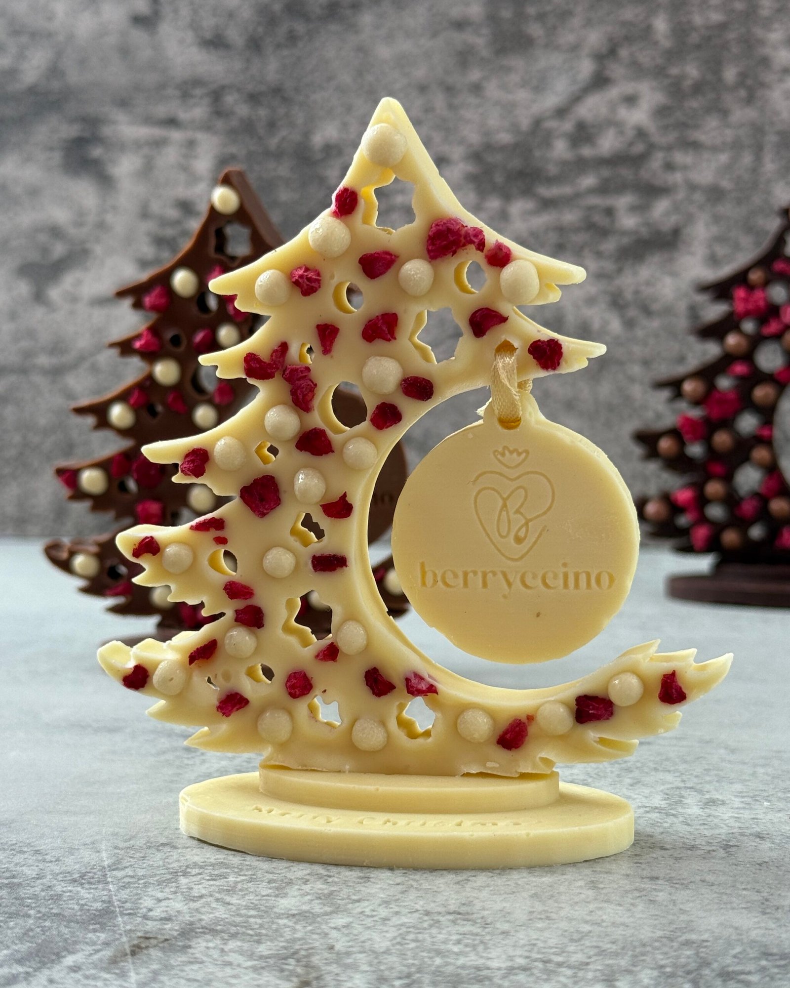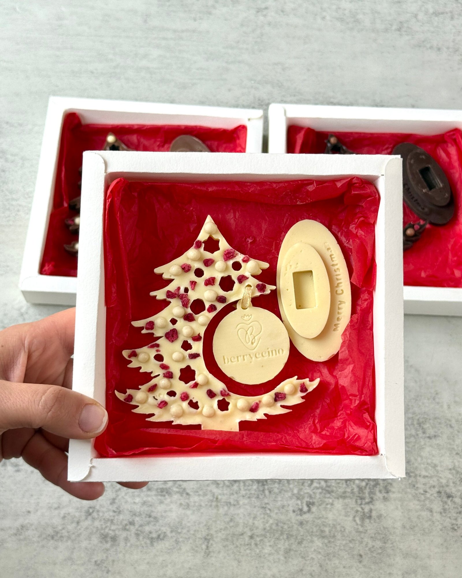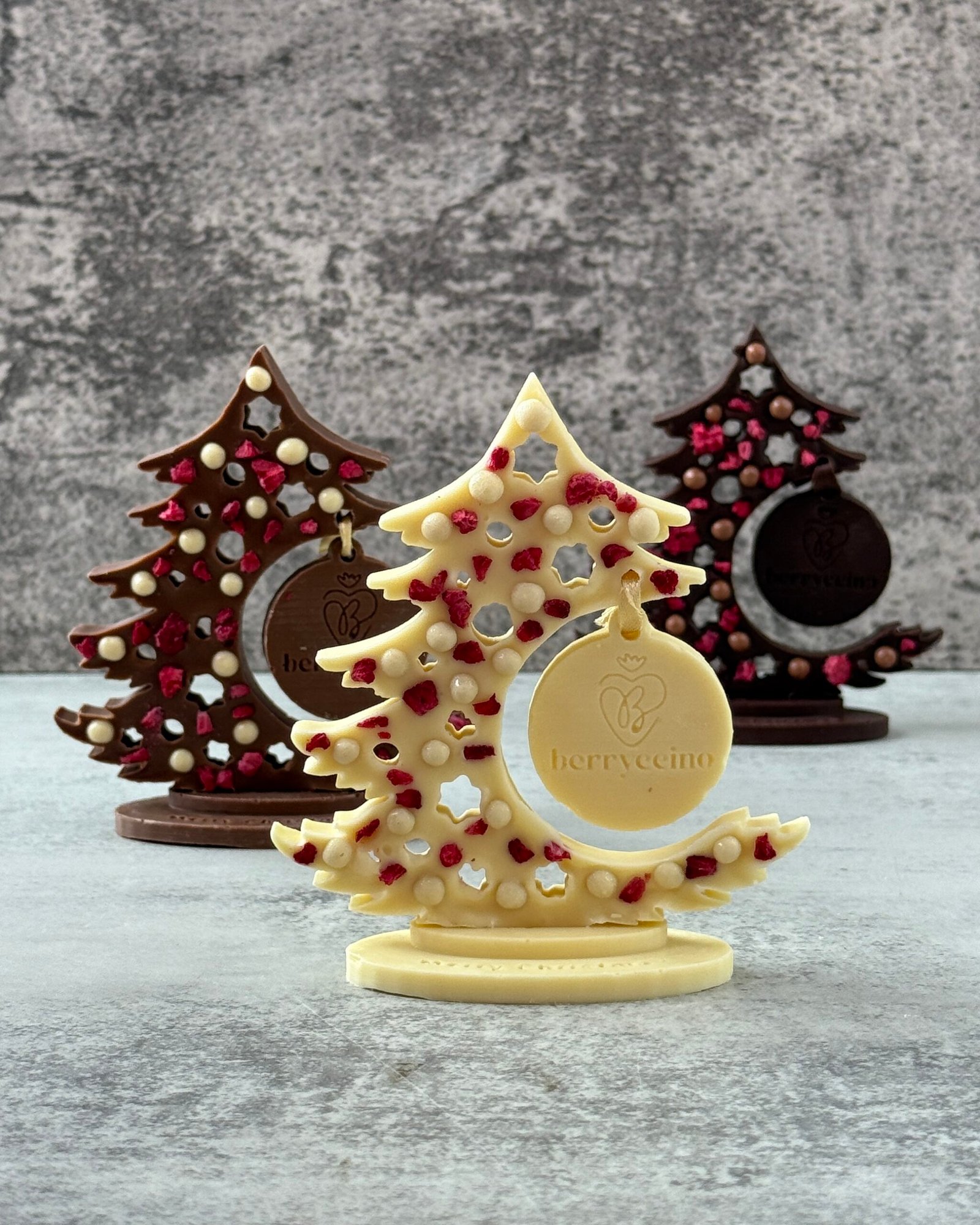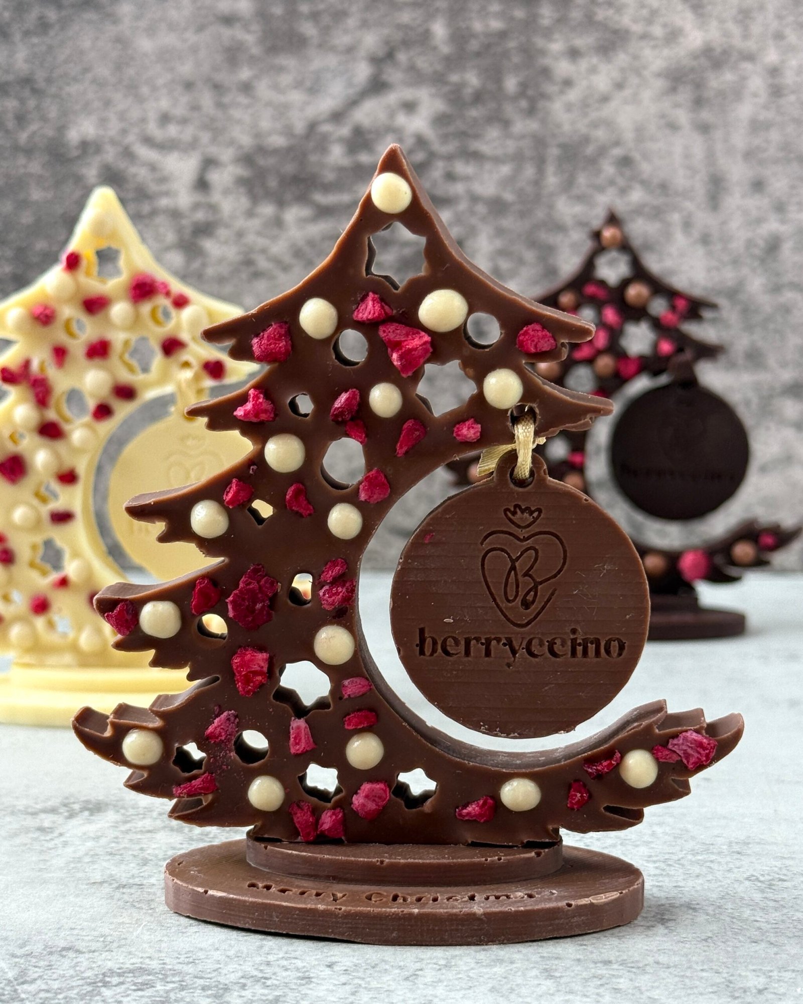 This unique Christmas tree is made entirely from premium molded chocolate and features a swinging chocolate ornament with the Berryccino logo, created using a custom-designed mold exclusive to our brand. Every detail is thoughtfully crafted, turning chocolate into an edible piece of art.