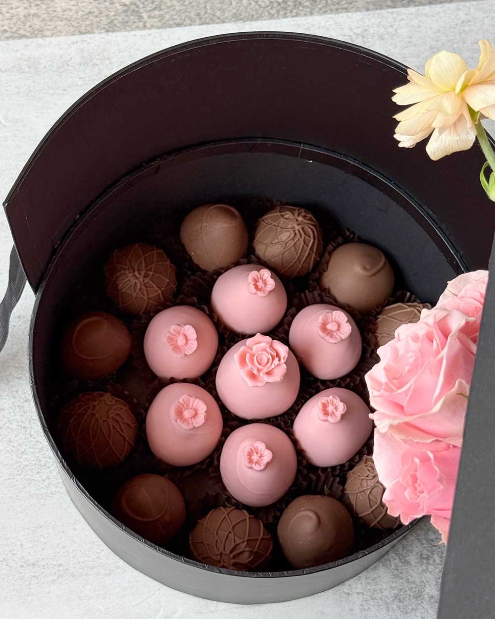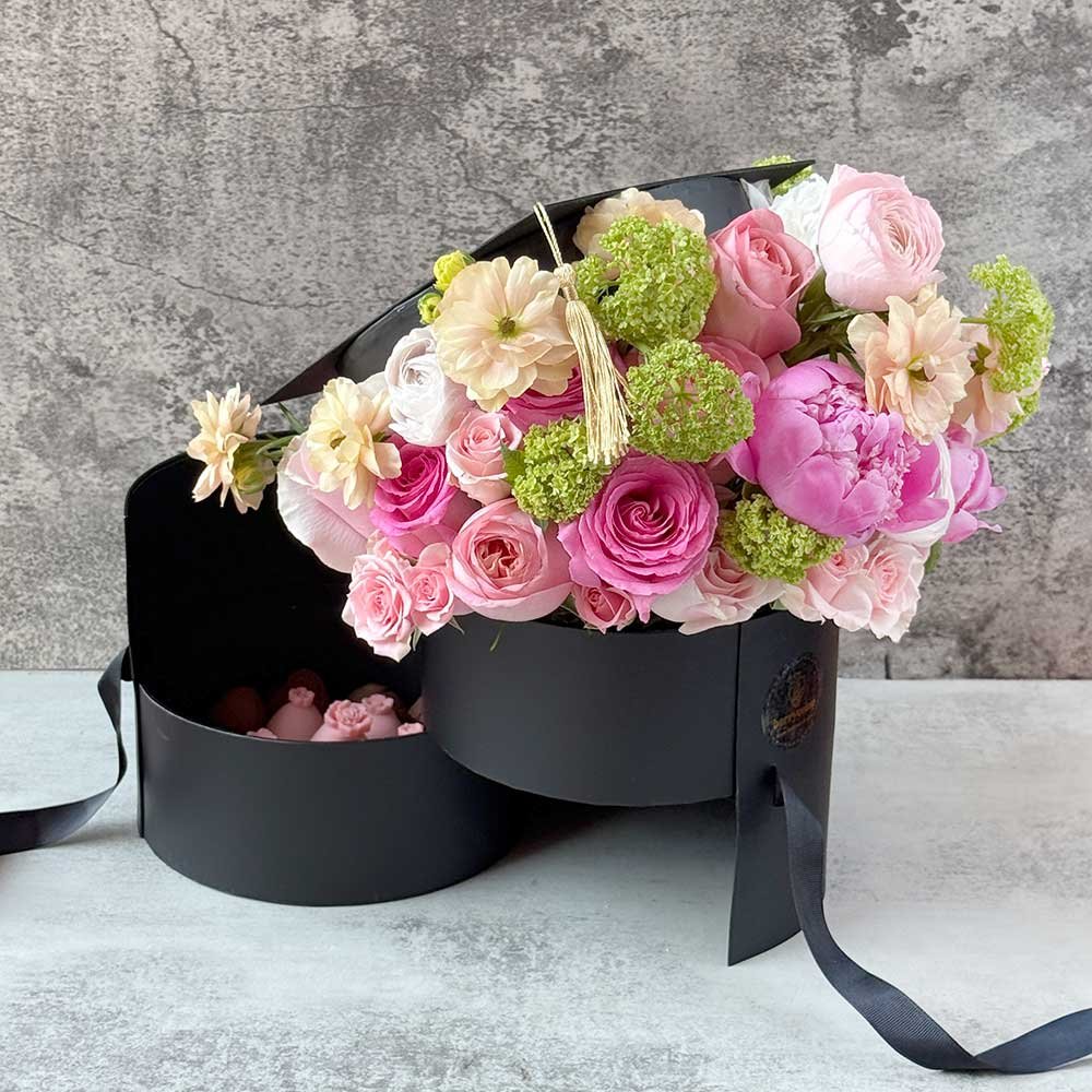 Not only are these confections delectable, they are also aesthetically pleasing. Each arrangement is artfully adorned with two types of beautiful flowers, chosen with care and precision to enhance the overall allure of the set. The blooming flowers against the backdrop of glossy chocolate make for a sight as tantalizing as the strawberries are delicious.